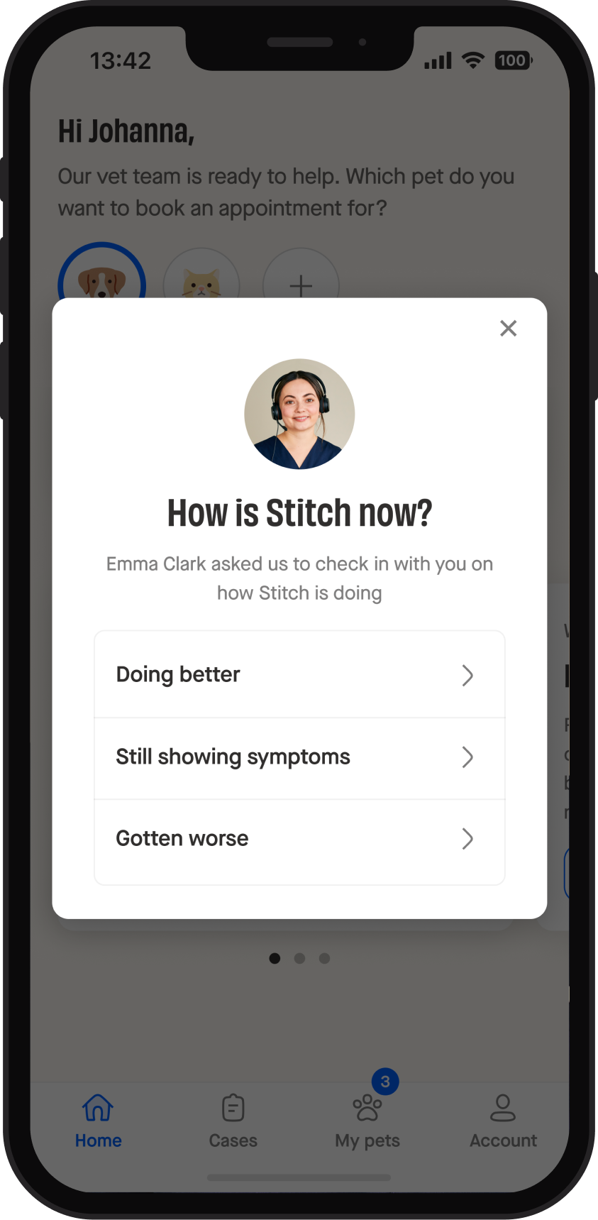 Kokeneet eläinlääkärimme arvioivat lemmikkisi tilanteen videopuhelun välityksellä ja lähettävät sinut aina eteenpäin fyysiselle klinikalle, jos siihen on tarvetta.